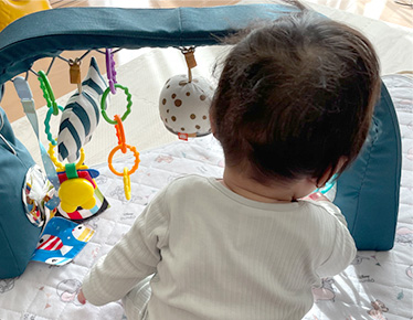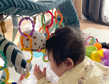 おもちゃを引っ掛けるところが沢山あるので、色んなおもちゃを付けてます(映えないけど!笑)ジムに繋げておくことでおもちゃがどこかへ転がっていくこともなくなりました!