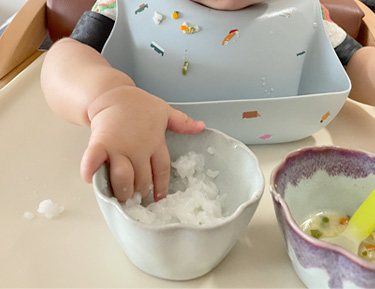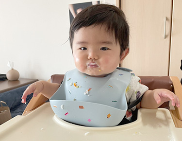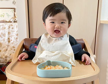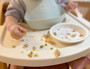 自分で動き回れるようになってからはバンボやセルフお座りでご飯を食べるのは難しくなってきましたが、スクロールチェアで食べる時は大人しく座って食べてくれます。