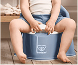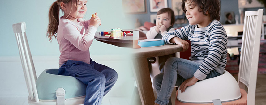 ブースターシートは、丈夫なベルトでしっかりと、そして簡単にダイニングチェアに固定でき、調整も可能です。座面はテーブル側にのみ開放され、背もたれに寄りかからないため正しい座り方が自然に身につきます。角のないやさしい安全なデザインです。