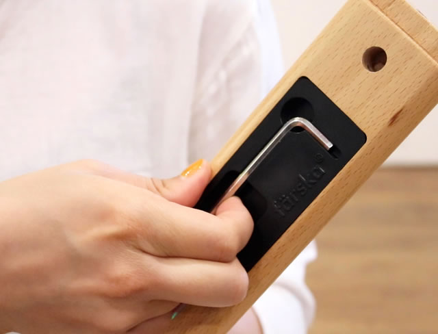(1).まず、ボトムバー(ロゴ入りの棒)から六角レンチを取り出します。組み立て後もボトムバーに収納することで、ハイチェアの組み替えがスムーズです。