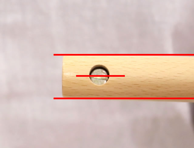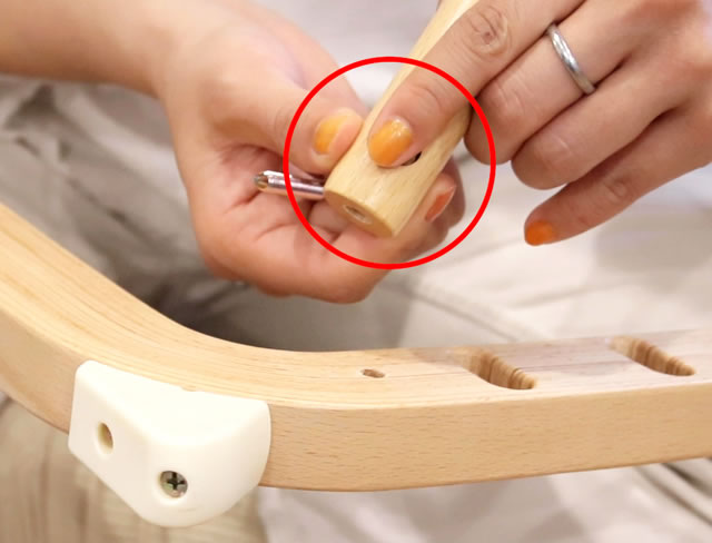 (4).ナットが落ちないように指で押さえながら、フレームの一番小さな穴に差し込みます。この時、膝の上など段差を利用するとやりやすいです。