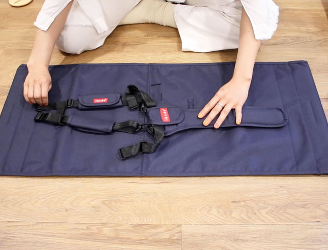 (3).肩ベルトを外したらヘッドサポートを用意し、ベルト穴の下側から上側へ引き出します。