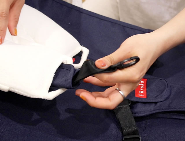 (4).まず、セーフティベルトの面テープをループに通して留めます。