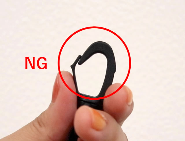 (5).フックの噛み合わせも確認してください。間違った噛み合わせをすると、フックが外れやすくなります。手で簡単に直せるので正しく装着しましょう。