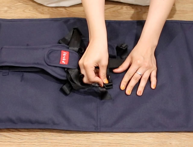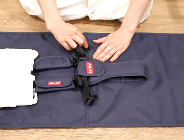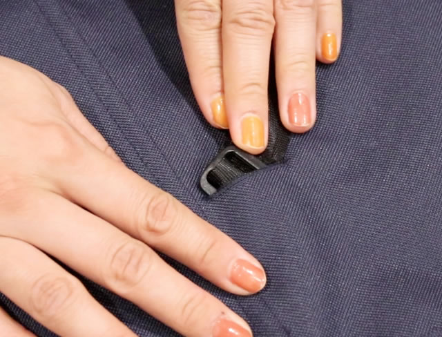(8).面テープをループに通し、4箇所の固定パーツをシートに取り付けます。固定パーツはベルト穴に対して横みきに入れましょう。