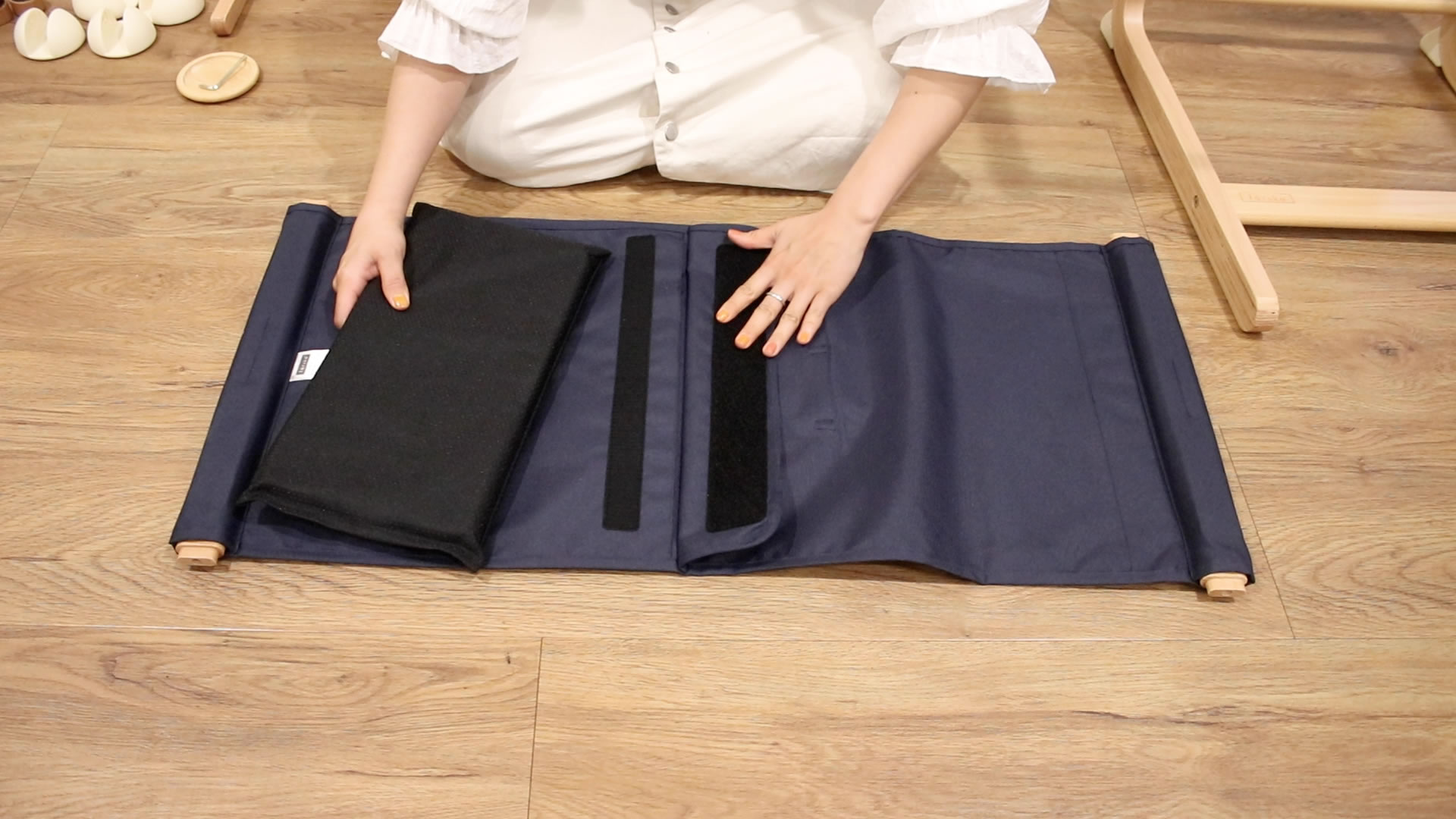 (5).硬い面を上にしたマット(小)をシートのポケットに入れます。ポケットの一番奥までマット(小)を入れ、シートのタグのある面を裏側にします。