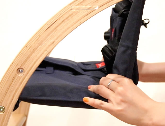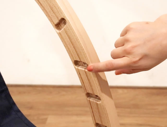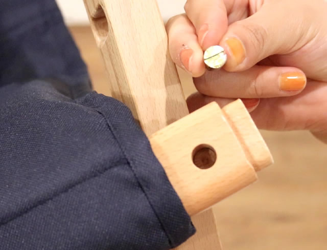 (5).座面側の平棒を、床に対して平行に空いた溝に取り付けます。シートを片手で持ちながら、緩くネジを締めてください。