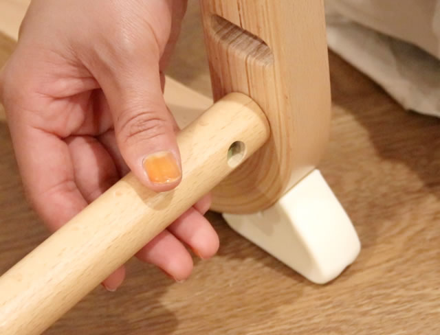(7).次にフットレストを取り付けます。フットレストは床に対して平行な溝3〜5番目に入れます。お子さまの成長に合わせて調節しましょう。