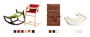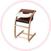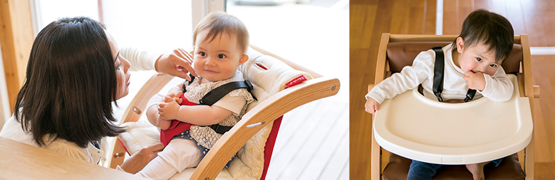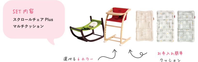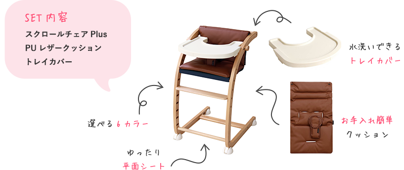 スクロールチェア本体、食べこぼしのケアが簡単なレザーシート、トレイカバーがセットになっているので、すぐに離乳食をスタートできます。
