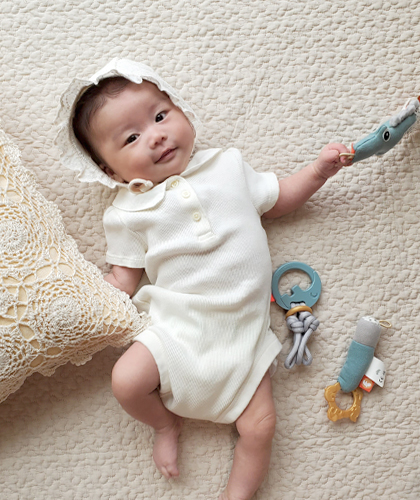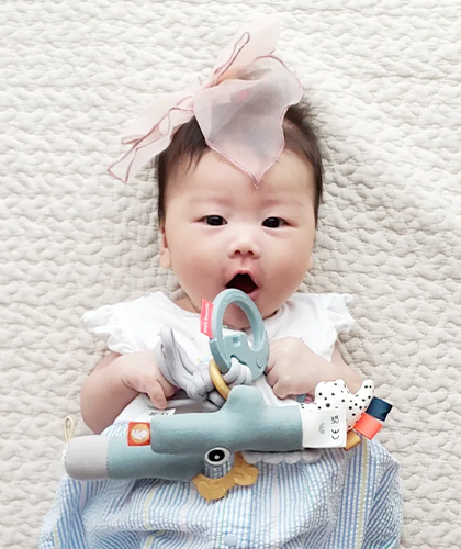 最近、手を舐めだしたり服を引っ張ったりしてグー以外の手が増えてきたので、体の上におもちゃを乗せてみました!