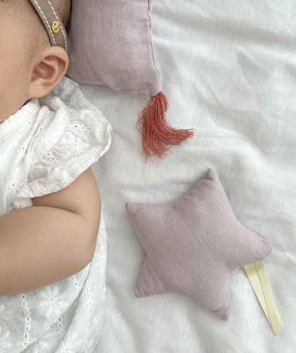 腕通し用のゴム付きピローは、汗ばみがちな授乳でも活躍◎やさしい鈴の音がリンリン聞こえる星形ラトルとセットになったギフトボックスです。