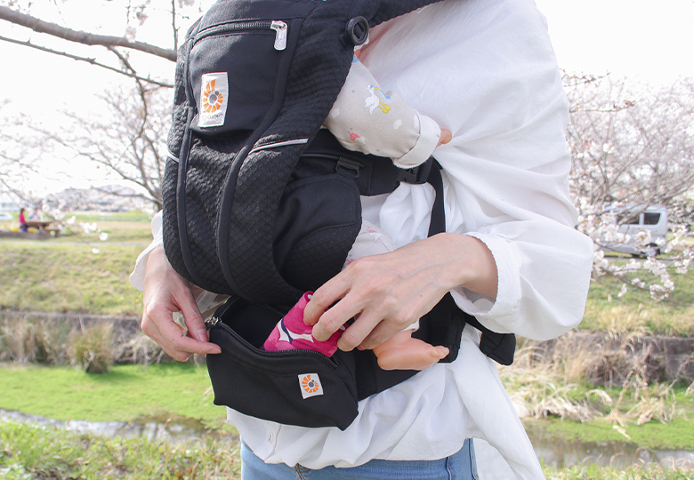 ママバッグに入れるとなかなか埋もれてすぐに出せない…という方はポケット、ポーチ付きの抱っこ紐がおすすめです。