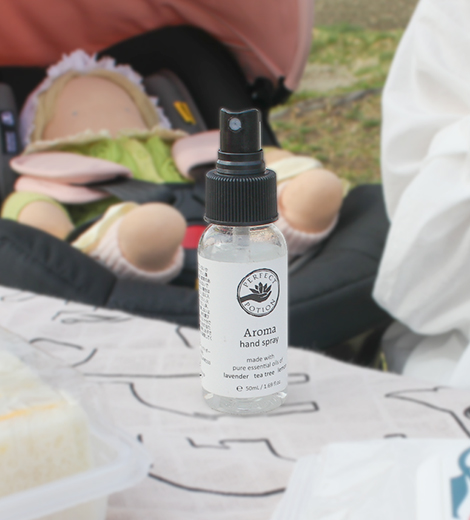 公園でのお食事前、赤ちゃんのお世話前など、気になった時にシュッ!100%ナチュラル素材のハンドスプレーは、赤ちゃんにも安心してご利用いただけます。