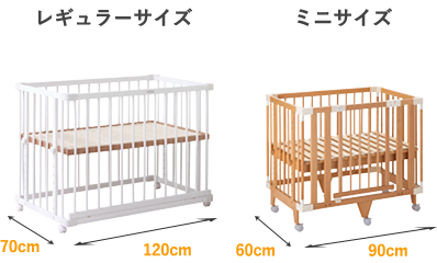 日本規格70×120cmのレギュラーサイズが主流ですが、マンション住まいの家族も増えてきているため60×90cmのミニ(コンパクト)サイズのベッドも人気です。