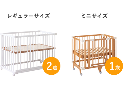 レギュラーサイズのベビーベッドはおおよそ2歳ごろまで、ミニサイズのベビーベッドは1歳ごろまでご利用いただけます。 ベビーベッド使用後「ママのベッドで添い寝」「キッズ用ベッドを購入」など、どのように赤ちゃんを寝かせるか、お考えいただいてからのご購入がオススメです。