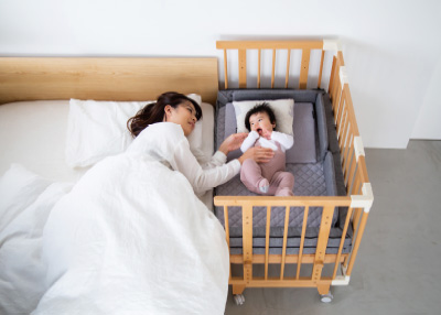 日本は昔から親子で川の字で寝てきたように、「添い寝」の文化が根付いています。 添い寝をすることで睡眠を促すホルモン「メラトニン」が分泌され、赤ちゃんが夜ぐっすり眠り、夜泣きが減るというメリットも! 添い寝をする際は、添い寝に特化したべビーベッドをお選びください。