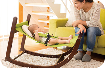 新生児期はゆりかごとして赤ちゃんのリラックスできる居場所となり、離乳食を開始する頃にはチェアとして家族一緒のテーブルでの食事を叶えてくれます。家族の側で楽しそうに過ごすお子さまが思い浮かびませんか。