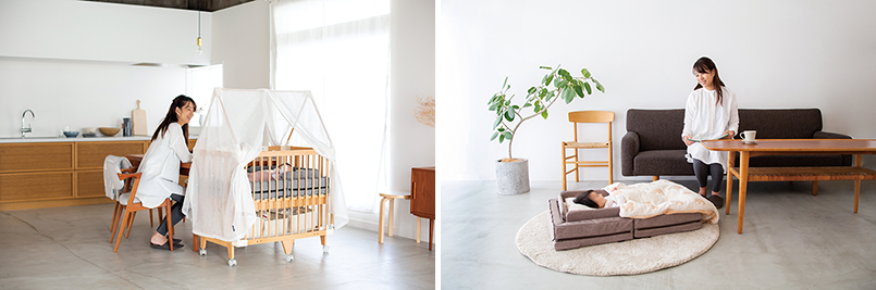 これまで提案してきた「ママと赤ちゃんが絆を深める添い寝育児」「狭小空間でも使いやすいコンパクト性」「永く使えること」。そして「ママパパが暮らしている生活の中に溶け込み馴染むこと」。それぞれ想いが込められたアイテムが、現代の暮らしと育児を支える特徴を持った魅力的な形となり生まれてきました。