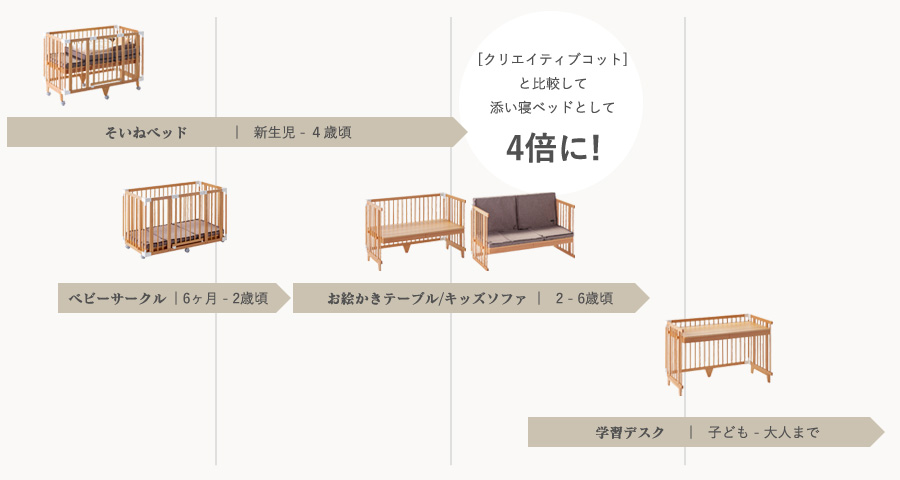 同型の「クリエイティブコット」ではベビーベッドとしては約1歳までしか活用できませんでしたがサイズを30cm伸ばすことで“4歳”頃までベッドとしてお使いいただくことができるようになりました。