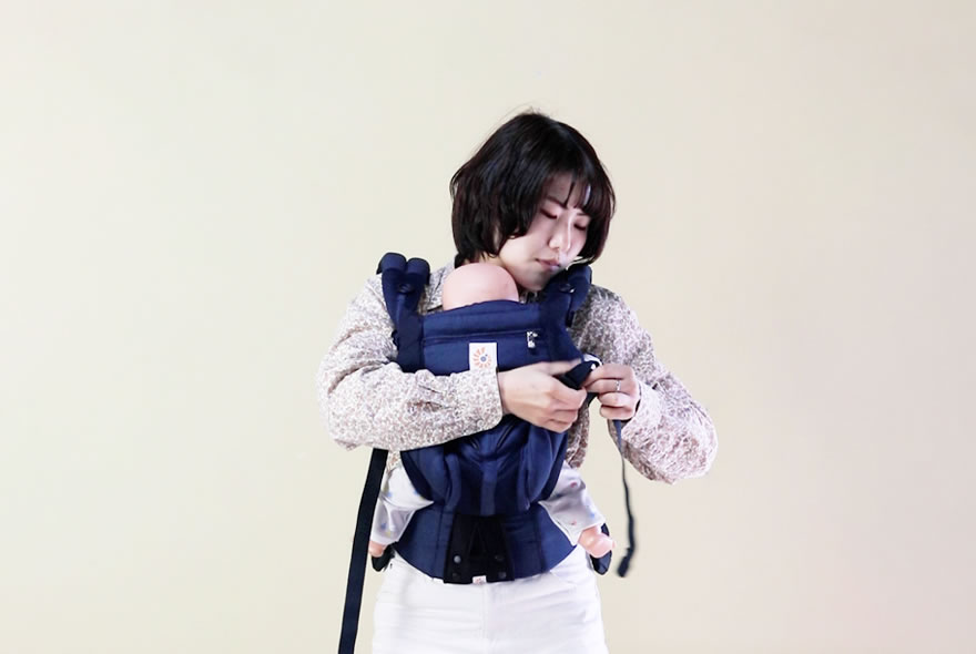 最初に装着したのはONE KAI Air。抱っこ紐を被って、バックル操作して…最後にストラップをギュッと締めると、162cmで肩幅広めの私の体に気持ちいいフィット感!まだ1つ目の抱っこ紐なのに、自分が買う時がきたらONE KAI Airにしよう、と思ったくらいです。